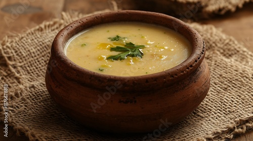 A rustic clay bowl filled with cream of broccoli soup, isolated on a textured burlap mat