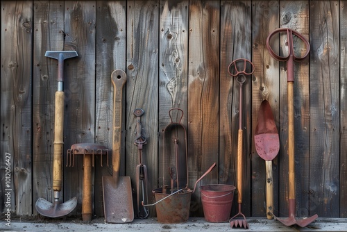 A rustic garden shed displaying various gardening tools and potted plants on a wooden wall in a serene outdoor setting under soft afternoon light