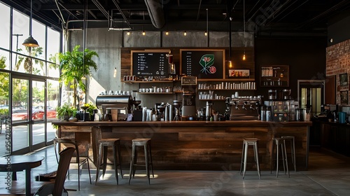 A rustic industrial coffee shop with eco-friendly messaging and warm tones