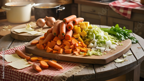 A rustic kitchen setting with chopped carrots, onions, and celery on a wooden cutting board, ready to be used in a soup or stew.