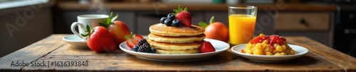 A rustic kitchen table laden with a delicious and healthy breakfast spread; perfectly ripe fruit, fluffy pancakes, and steaming coffee await a hungry start to the day , eggs, strawberries