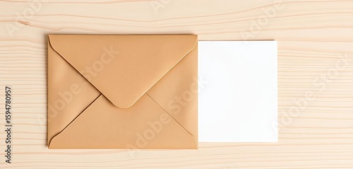 A rustic, kraft paper envelope rests beside a blank card on a light wood surface, ready for personalized messaging, vintage, card