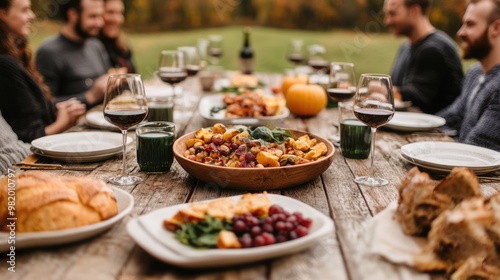 A rustic outdoor dining scene with friends enjoying a feast of seasonal foods and wine, surrounded by nature's beauty and vibrant autumn colors.