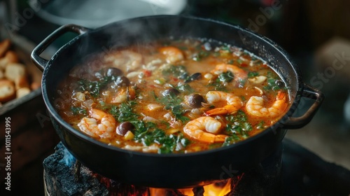 A rustic pot of tom yum soup cooking over an open flame, with ingredients like shrimp, mushrooms, and Thai herbs bubbling in the broth.