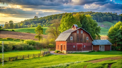 A Rustic Red Barn Stands Proudly in a Lush, Rolling Green Meadow with a Vibrant Sunset Sky Overhead