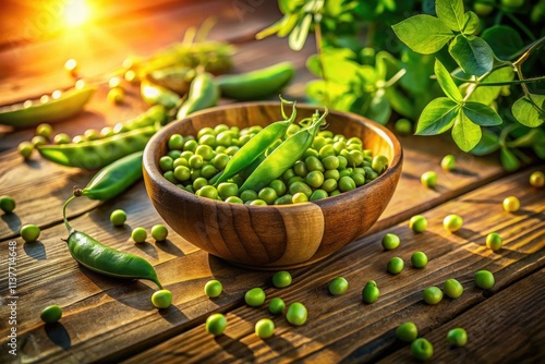 A rustic table holds a bowl overflowing with vibrant green pea pods, a still life celebrating fresh, organic vegetables.