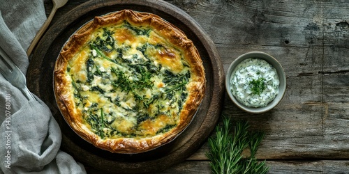 A rustic table setting featuring a spinach and feta pastry with a small bowl of tzatziki sauce on the side