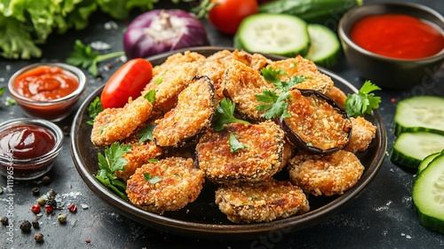 A rustic tabletop setting with French fried eggplant, served on a vintage dish and surrounded by fresh vegetables and sauces