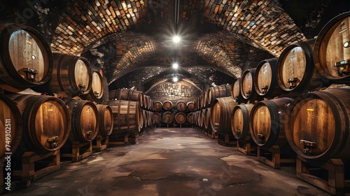 A rustic underground wine cellar filled with oak barrels aging wine. Concept Wine Cellar, Oak Barrels, Aging Process, Rustic Decor, Underground Setting