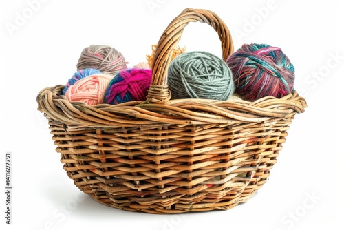 A rustic wicker basket overflowing with vibrant yarn balls, perfect for cozy crafting during a sunny afternoon isolated on transparent background