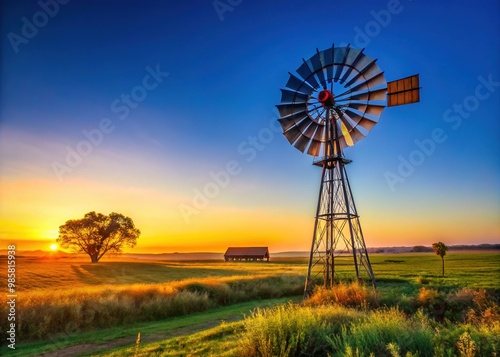 A rustic windmill stands proudly against a vibrant blue sky, surrounded by lush fields, as the sun rises, casting golden light over the serene agricultural landscape.