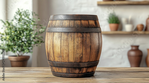 A rustic wooden barrel artwork symbolizes tradition and heritage, set against a clean, bright background with modern minimalism, highlighting contrast and inviting reflection on timeless values.