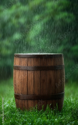 A rustic wooden barrel sits peacefully in the rain, surrounded by lush green grass, creating a serene natural scene.