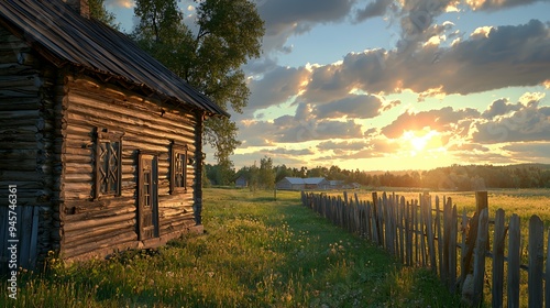 A rustic wooden cabin at sunset, surrounded by a lush field and a wooden fence.