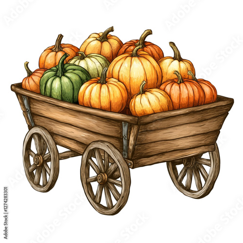 A Rustic Wooden Cart Overflowing with Colorful Pumpkins Autumn Harvest Bounty