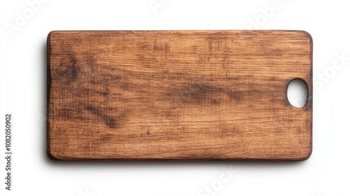 A rustic wooden cutting board featuring a round handle, showcasing natural grain and texture.