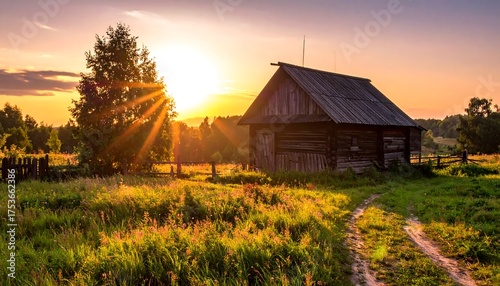 A rustic wooden structure sits in a sunlit field at sunset. Tall grasses and a dirt path lead toward the building, with trees lining the background