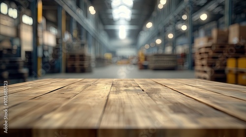 A rustic wooden table in focus, set against a blurred warehouse backdrop filled with pallets and ambient lighting.