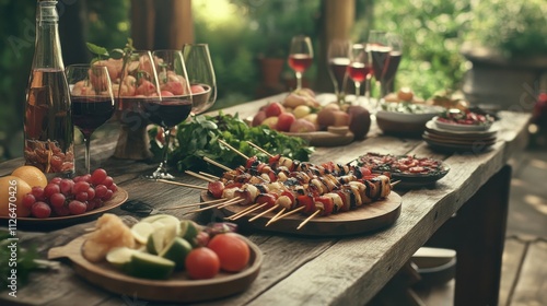 A rustic wooden table is set for a casual summer gathering featuring an array of fresh foods like skewers, fruits, and wine. The atmosphere is inviting and relaxed, perfect for dining.