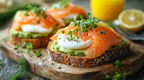 A rustic wooden table set with avocado toast layered with poached eggs and smoked salmon, garnished with microgreens and lemon slices,