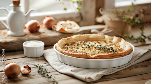 A rustic wooden table with a vibrant onion tart.