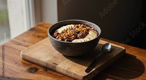 A rustic wooden table with an artisanal açai bowl topped with granola, banana slices, and bee pollen, morning sunlight streaming through a window, food photography style, shallow depth of field