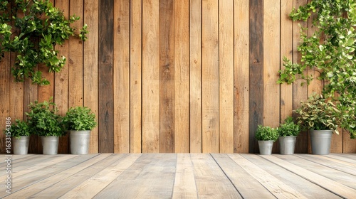 A rustic wooden wall with green plants and a wooden floor.