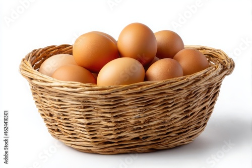 A rustic woven basket filled with fresh brown eggs isolated on white background