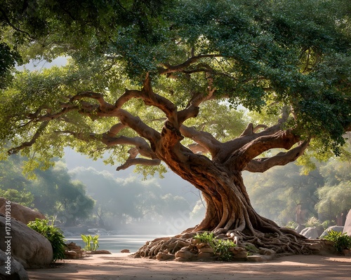 A sacred bodhi tree in a peaceful forest clearing, softly lit by golden sunlight. Lush, quiet, and spiritual—ideal for mindfulness, reflection, or natural serenity themes with copy space.