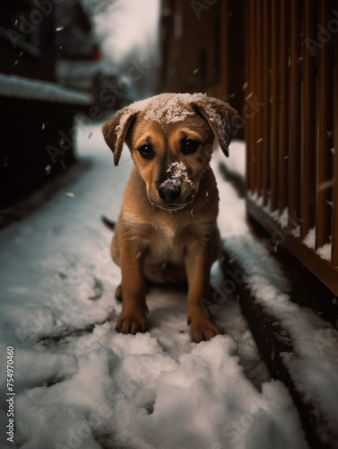 A sad cute puppy in the dog shelter sits in the cold snow next to a kennel. Generative AI
