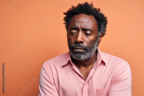 A sad man, 50, African American, dealing with stress, on a pastel soft peach background