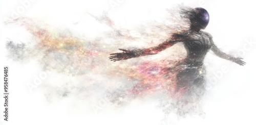 A sad-looking man in a large helmet with bright stars and galaxies projected on his shield and behind his back against a white background.