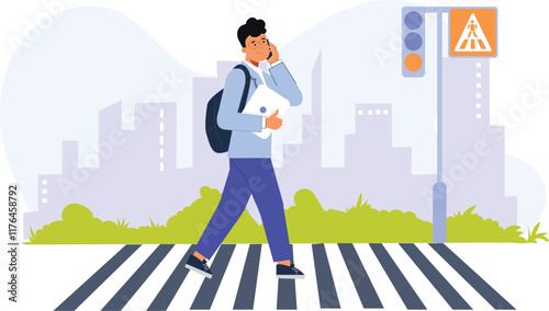A safe walking illustration featuring a zebra crossing scene, with pedestrians, including children and adults, carefully crossing the street on a marked pedestrian lane, with road signs