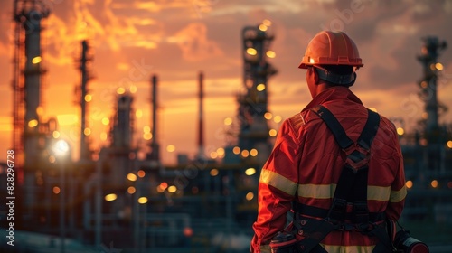 A Safety gear kit standing in front of oil refinery background