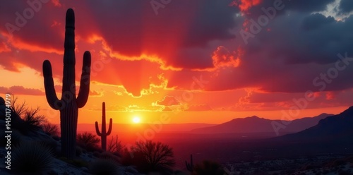 A saguaro cactus silhouetted against a sunset sky, american, arid