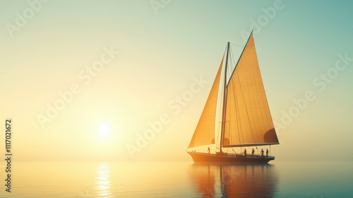A sailboat glides gracefully on calm waters during a golden sunset, creating a tranquil and serene maritime scene.