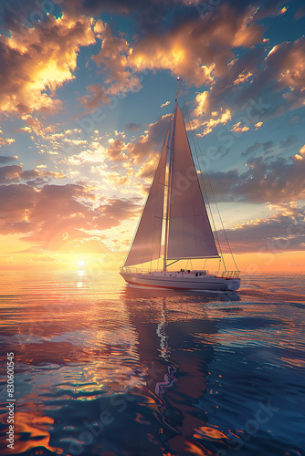 A sailboat sailing in the sunset sea from an aerial perspective
