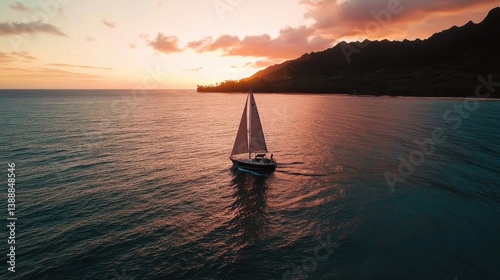 A sailing boat glides across the shimmering water at sunset, with a picturesque coastline in the background.