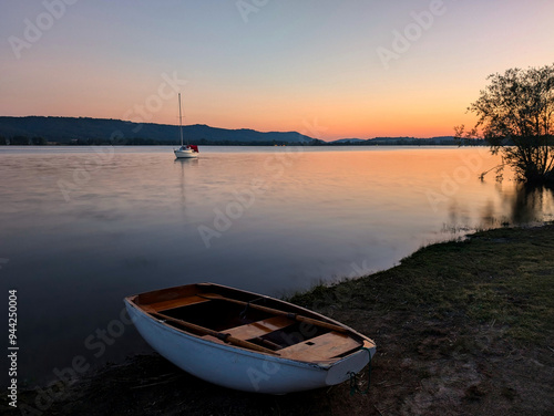 a sailing boat on bodensee at the blue hour with calm smooth water and a rowing boat on the shore