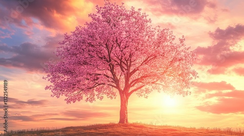 A sakura tree with radiant pink blossoms standing alone against a warm golden and red sunset
