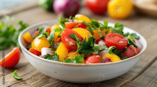 A salad bowl brimming with chopped Big Jim peppers and fresh vegetables.