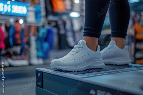 A sales girl in a sportswear and shoe store demonstrates a new model of sneakers on her foot.