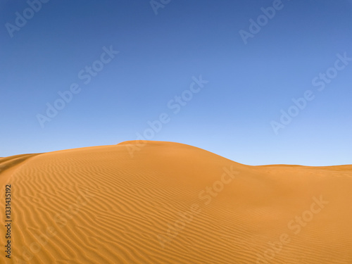 A sand dune against a clear blue sky. Waves of sand. Natural background. Сopy space.