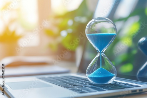 A sand timer is on a laptop, with the sand falling into the timer. Concept of urgency and the importance of time management