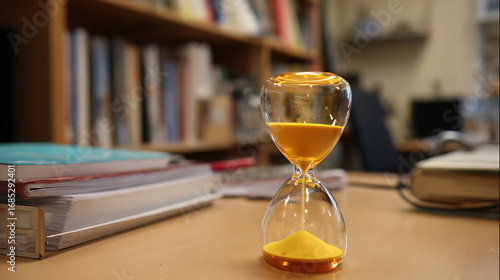 A sand timer on the study table symbolizing the impending book review deadline for a student