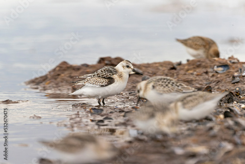 A sanderling (Calidris alba) foraging during fall migration on the beach.