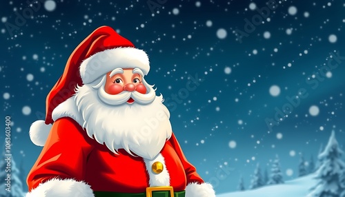 A Santa Claus , with bold red and green colors, golden accents, and a snowy night sky background.