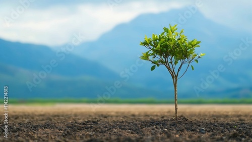 A Sapling's Promise: A solitary sapling thrives in the fertile soil of a vast, open landscape, its vibrant greenery contrasting against a backdrop of distant, misty mountains.