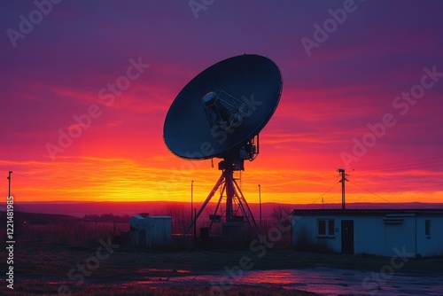 A satellite dish sits atop a lush green grassy field, suitable for outdoor use or rural setting
