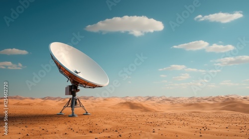 A satellite dish stands alone in a vast desert landscape under a clear blue sky, showcasing the contrast between technology and nature.